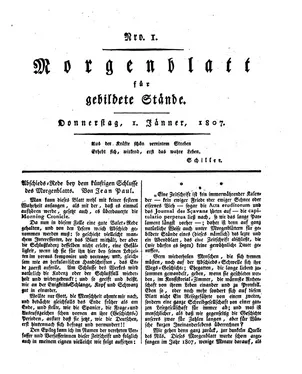Morgenblatt für gebildete Stände, founded in 1808 by the prominent writer and politician Karl Friedrich von Schlegel, is a significant periodical based in Stuttgart, Baden-Württemberg, Germany. Originally aimed at the educated elite, it has played a vital role in shaping literary and cultural discourse during the formative years of German Romanticism. The newspaper features a diverse array of content, including literary critiques, essays on philosophy, and cultural commentary, appealing to a sophisticated readership. Renowned for its intellectual depth, Morgenblatt influences public opinion and fosters critical thought in contemporary German society. On OldNews.com, you would find scans of Morgenblatt Für Gebildete Stände starting 1807, including 199,610 scans in total. This is a chance to explore historical figures and events that may connect to your own family history, encouraging you to dive into the rich past preserved in these pages.