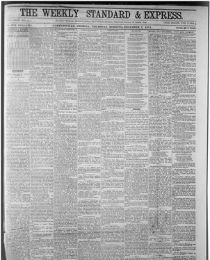 The Weekly Standard & Express, established in 1886 by local entrepreneurs in Cartersville, Georgia, has been a cornerstone of community journalism for over a century. Initially focused on local news, it has grown to encompass investigative reports, lifestyle features, and regional affairs, earning respect for its commitment to factual reporting and balanced perspectives. This dedication has made it a trusted source for residents, reflecting the values and interests of its readership. On OldNews.com, you would find scans of The Weekly Standard & Express, Cartersville, Georgia, United States starting 1871, including 11 scans in total. You might discover mentions of historical figures or notable events, and perhaps even connections to your own family history. Dive into the archives and explore this influential publication's rich legacy while learning about the past that shaped your community.