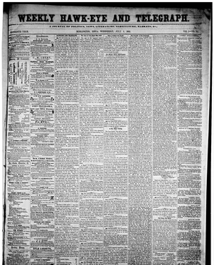 The Weekly Hawk-Eye and Telegraph, founded in 1847 by John S. Harlan in Burlington, Iowa, has a rich history as a key source of local news. Over the years, it has adapted to the changing media landscape while maintaining its commitment to community engagement. The newspaper offers a diverse range of content, including local news, sports, opinion pieces, and lifestyle articles, appealing to a broad audience. Renowned for its thorough reporting and community involvement, it has established itself as a trusted source of information, influencing public discourse and amplifying local voices in southeastern Iowa. On OldNews.com, you would find scans of the Weekly Hawk-Eye and Telegraph, Burlington, Iowa, United States starting 1855, including 413 scans in total. This resource invites you to explore historical figures and events, perhaps even uncovering stories of your own family history within these pages.